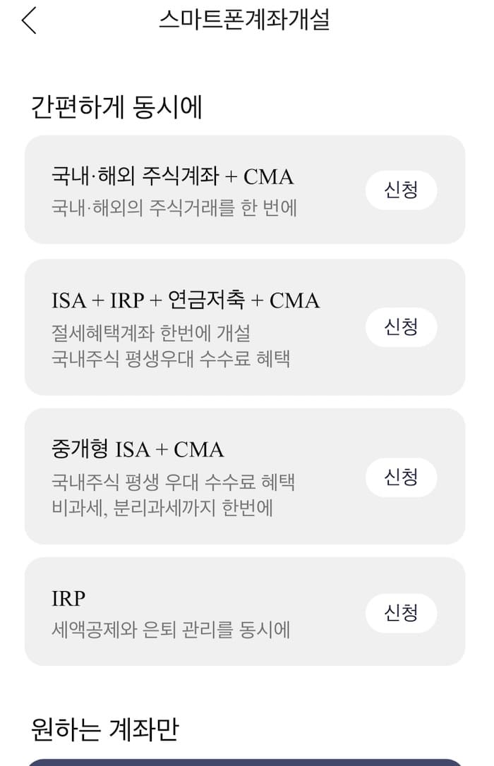 본격적으로 가입을 하게 되면 원하는 계좌를 선택합니다. 한국투자증권에서는 그림에서 보는 것처럼 다양한 계좌를 동시에 개설할 수 있는 옵션들을 제공하고 있습니다. 이왕이면 2번째로 선택해서 한 번에 4가지 계좌 개설하면 편하겠죠.