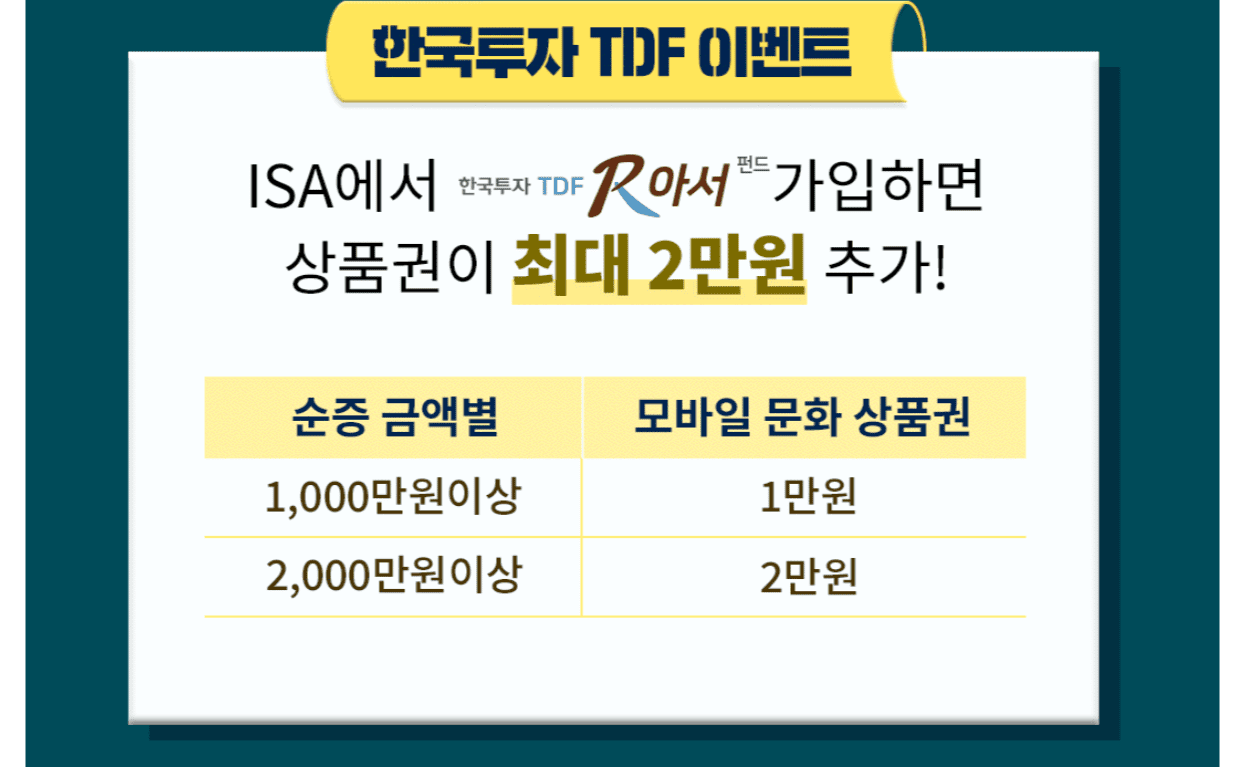 또 TDF 가입 시 가입 금액에 따라 문화 상품권을 추가로 증정합니다. TDF 펀드는 가입자의 연령에 따라 목표 금액 투자를 위해 위험/안정형 자산의 비중을 자동적으로 바꿔가며 투자해주는 펀드입니다.